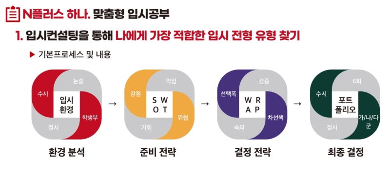 강남N플러스 대입컨설팅을 통해 정시 수능성적, 내신성적, 논술 실력 등을 고려해서 본인의 목표 대학과 학과를 설정하고, 본인에게 꼭 맞는 대학전형을 준비할 수 있습니다. 또한, 모의지원과 입결 등을 통해 합격 가능성을 검증하고, 최종 파이널 콜 상담까지 문닫고 합격할 가능성을 많이 높일 수 있습니다.