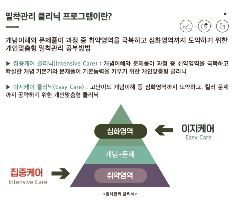 1대1 클리닉을 통해 어렵고 부족한 영역에 대한 집중케어를 받을 수 있습니다. 그리고, 킬러문제 유형 등 고난도 문제에 대한 이지케어를 통해 효과적인 공략법을 습득할 수 있습니다. 꼼꼼한 1대1 클리닉을 통해 탁월한 실력까지 성장할 수 있습니다.