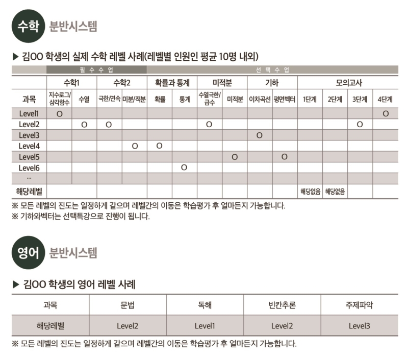 학기마다 분반고사를 치러 학생 수준에 맞는 반을 총 5개로 세분화하여 배정해주십니다.