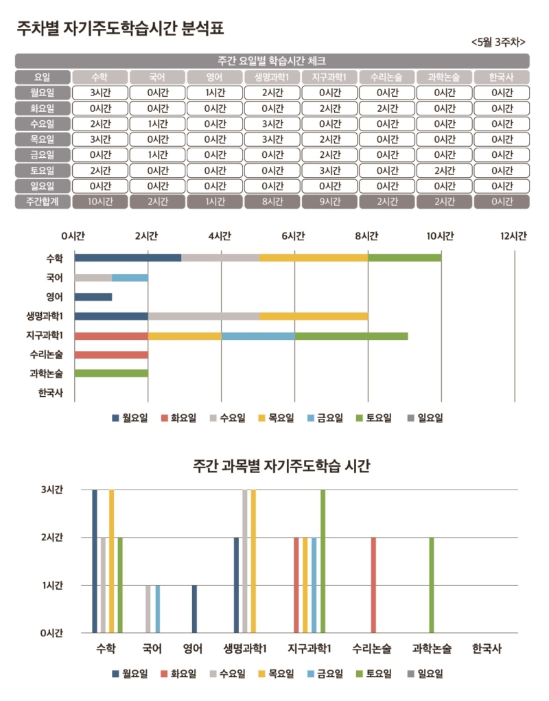 수업, 테스트 외 자습 가능시간을 매일, 매주, 매월 단위로 구분해서 과목별로 필요한 공부계획을 수립합니다. 공부계획에 따른 공부시간 사용과 공부결과를 분석해서 취약과목에 더 공부시간을 집중할 수 있게 됩니다. 이렇게 되면 효과적인 시간배분이 가능하고, 과목별 공부밸런스를 유지하면서 가성비 높은 공부가 가능합니다. 또한, 하루 학습시간 내에 학습 몰입도를 극대화할 수도 있습니다.