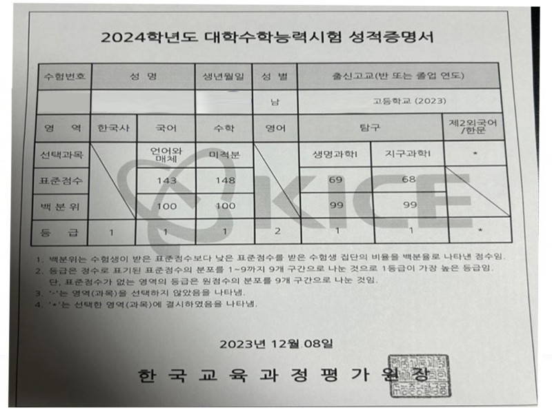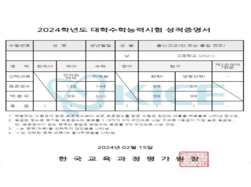 재수 수능에서는 국어, 수학은 높은 2등급, 한국사는 2등급, 영어와 생명과 지학은 모두 1등급이 나왔습니다.