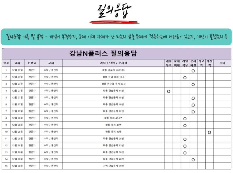 질의응답은 공부의 시작입니다. 특히, 수능 수학, 국어, 과학과 같이 사고형 과목들의 경우 개념 간의 상관관계로 인해서 공부의 길을 잃기 쉽습니다. 왜냐하면, 이전 개념에 대한 이해가 부족한 경우에 다음 개념에 대해 이해하는 것은 정말 쉽지 않기 때문입니다. 소수정예 강남N플러스에서는 질의응답이 무제한입니다(어떤 학생은 한 달에 200건 내외의 질의응답을 진행한 경우도 있습니다.) 질의응답 과정은 질문자, 답변자, 질문이유 및 내용 등으로 상세 기록됩니다.